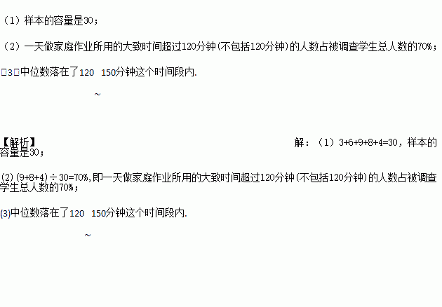 (2)在被调查的学生中,一天做家庭作业所用的大致时间超过120分钟(不包括120分钟)的人数占被调查学生总人数的百分之几?