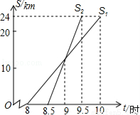 小亮家与姥姥家相距24km,小亮8:00从家出发,骑自行车去姥姥家.妈妈8:30从家出发,乘车沿相同路线去姥姥家.在同一直角坐标系中,小亮和妈妈的行进路程S(km)与北京时间t(时)的函数图象如图所示.根据图象得到小亮结论,其中错误的是( )