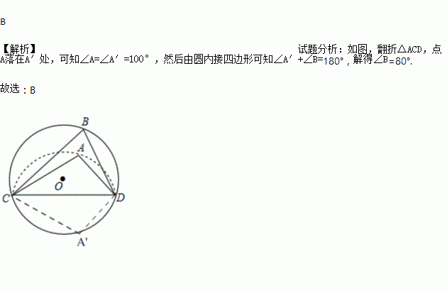 如图,CD是⊙O的弦,O是圆心,把⊙O的劣弧沿着CD对折,A是对折后劣弧上的一点,∠CAD=100°,则∠B的度数是( )