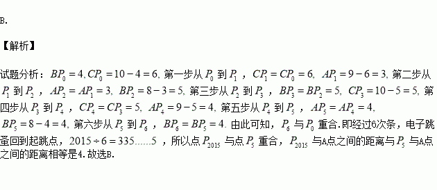 电子跳蚤游戏盘是如图所示的△ABC,AB=8,AC=9,BC=10,如果跳蚤开始时在BC边的点P0处, BP0=4.跳蚤第一步从P0跳到AC边的P1(第1次落点)处,且CP1=CP0;第二步从P1跳到AB边的P2(第2次落点)处,且AP2=AP1;第三步从P2跳到BC边的P3(第3次落点)处,且BP3=BP2;跳蚤按上述规则一直跳下去,第n次落点为Pn(n为正整数),则点P2015与A间的距离为( )