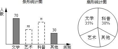 (2)由总人数乘以科普的百分比得到科普的人数,进而求出艺术的人数,即可确定出m与n的值;