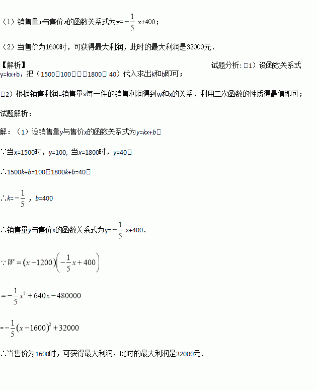 商场进了一批家用空气净化器,成本为1200元/台.经调查发现,这种空气净化器每周的销售量y(台)与售价x(元/台)之间的关系如图所示: