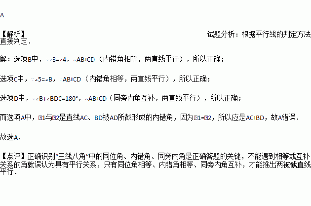 A. ∠4=∠3 B. ∠1=∠2 C. ∠B=∠5 D. ∠B+∠BCD=180°