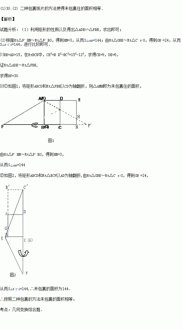 (2)在(1)的条件下,小红想用△EFG包裹矩形ABCD,她想了两种包裹的方法如图3、图4,请问哪种包裹纸片的方法使得未包裹住的面积大?(纸片厚度忽略不计)请你通过计算说服小红。
