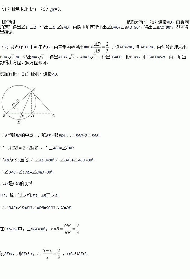 如图,以△ABC的边AB为直径作⊙O,与BC交于点D,点E是弧BD的中点,连接AE交BC于点F,