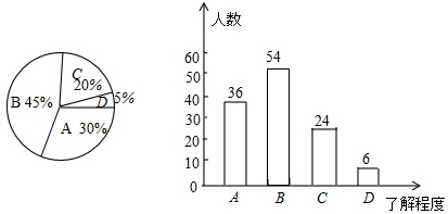 (2)B有120×45%=54(名),C占$\frac{24}{120}$×100%=20%,D占$\frac{6}{120}$×100%=5%,![]()