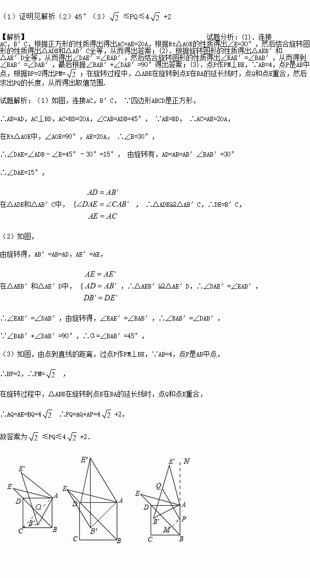 (3)如图3,点P为AB的中点,点Q为线段B′E′上任意一点,试探究,在此旋转过程中,线段PQ长度的取值范围为 .