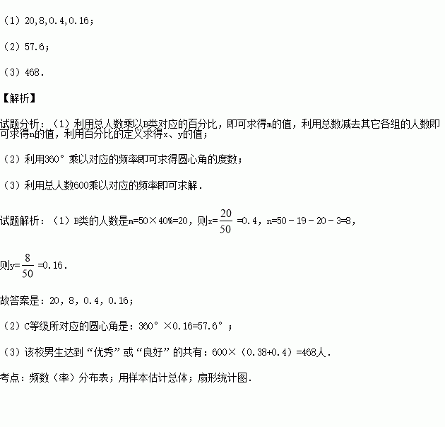 某校为了了解九年级男生立定跳远的成绩,从该校随机抽取了50名男生的测试成绩,根据测试评分标准,将他们的得分按优秀、良好、及格、不及格(分别用A、B、C、D表示)四个等级进行统计,并绘制成下面的扇形图和统计表: