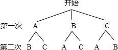 如图,现有三张质地和大小完全相同的不透明的纸牌,A、B、C,其正面画有菱形、等边三角形、正六边形,纸牌的背面完全相同,现将这三张纸牌背面朝上洗匀后随机抽出一张,再从剩下的纸牌中随机抽出一张,用画树状图或列表法,求两次抽到纸牌上的图形都为既是中心对称图形又是轴对称图形的概率(纸牌用A、B、C表示)