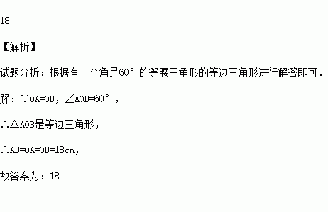 (2015•义乌市)由于木质衣架没有柔性,在挂置衣服的时候不太方便操作.小敏设计了一种衣架,在使用时能轻易收拢,然后套进衣服后松开即可.如图1,衣架杆OA=OB=18cm,若衣架收拢时,∠AOB=60°,如图2,则此时A,B两点之间的距离是 cm.