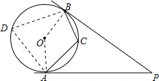 分析:连接OA,OB,在优弧AB上任取一点D(不与A、B重合),连接BD,AD,如图所示,由PA与PB都为圆O的切线,利用切线的性质得到OA与AP垂直,OB与BP垂直,在四边形APBO中,根据四边形的内角和求出∠AOB的度数,再利用同弧所对的圆周角等于所对圆心角的一半求出∠ADB的度数,再根据圆内接四边形的对角互补即可求出∠ACB的度数.