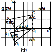 (2)根据平面直角坐标系写出体育场、市场、超市的坐标即可,