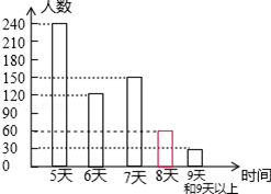 分析 (1)用1减去其它组的百分比即可求得a的值,利用360°乘以对应的百分比即可求得扇形圆心角的度数,再求得时间是8天的人数,从而补全直方图;