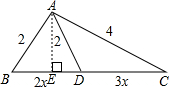 分析 过A作AE⊥BD,设BD=2x,CD=3x,根据等腰三角形的性质可得BE=ED=x,再根据勾股定理可得42-(x+3x)2=22-x2,解方程可得x的值,进而可得BC长,再利用勾股定理逆定理可得△ABC是直角三角形.
