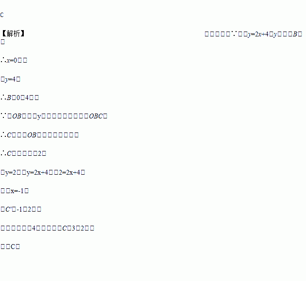如图,直线y=2x+4与x, y轴分别交于点A,B,以OB 为底边在y轴右侧作等腰△OBC,将点C向左平移4个单位,使其对应点C′恰好落在直线AB上,则点C的坐标为( )