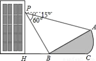 如图,小明在大楼45米高(即PH=45米,且PH⊥HC)的窗口P处进行观测,测得山坡上A处的俯角为15°,山脚B处得俯角为60°,已知该山坡的坡度i(即tan∠ABC)为1: