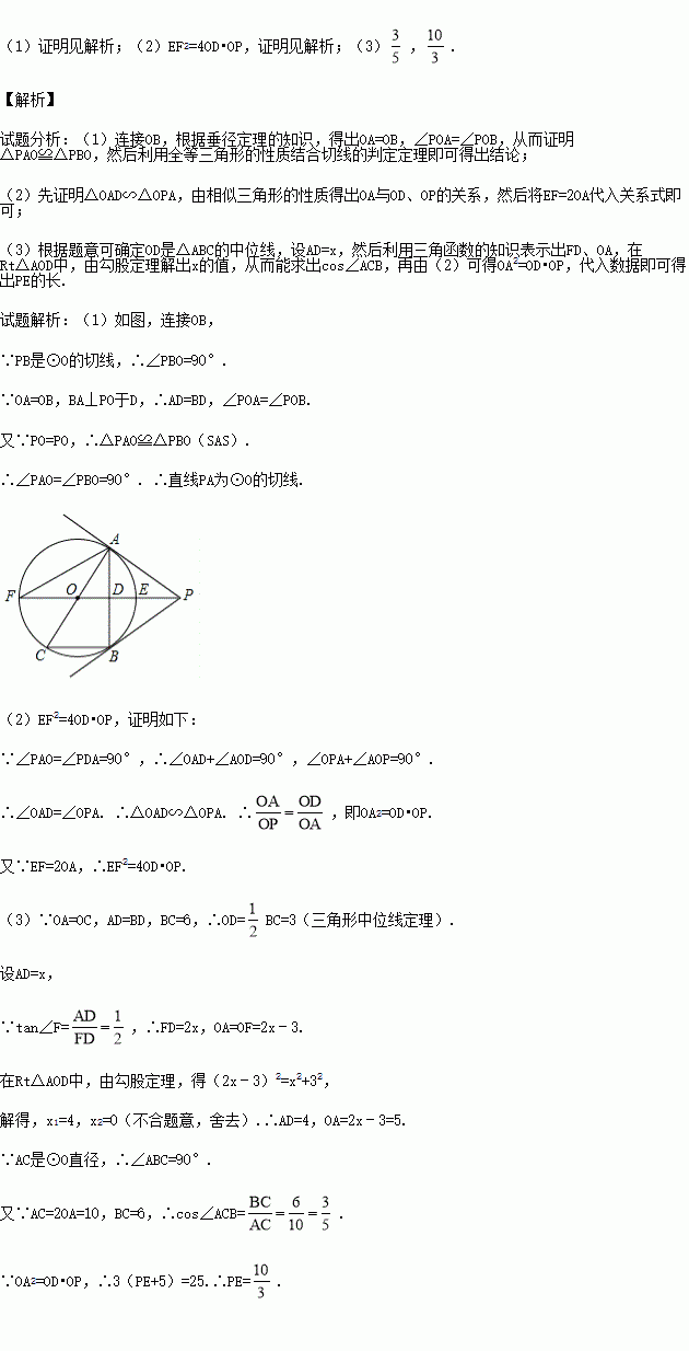 如图,PB为⊙O的切线,B为切点,直线PO交⊙于点E,F,过点B作PO的垂线BA,垂足为点D,交⊙O于点A,延长AO与⊙O交于点C,连接BC,AF.