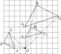 分析 (1)利用网格的特点和旋转的性质,画出点A、B、C的对应点A1、B1、C1的位置即可得到△A1B1C1;(2)利用位似变换的性质,延长OA1到A2使OA2=2OA1,则A2点为A1的对应点,同样方法作出B1的对应点B2,C1的对应点C2,从而得到△A2B2C2.