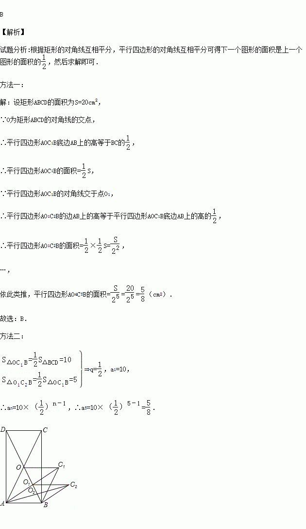 如图,矩形ABCD的面积为20cm2,对角线交于点O;以AB、AO为邻边做平行四边形AOC1B,对角线交于点O1;以AB、AO1为邻边做平行四边形AO1C2B;…;依此类推,则平行四边形AO4C5B的面积为( )