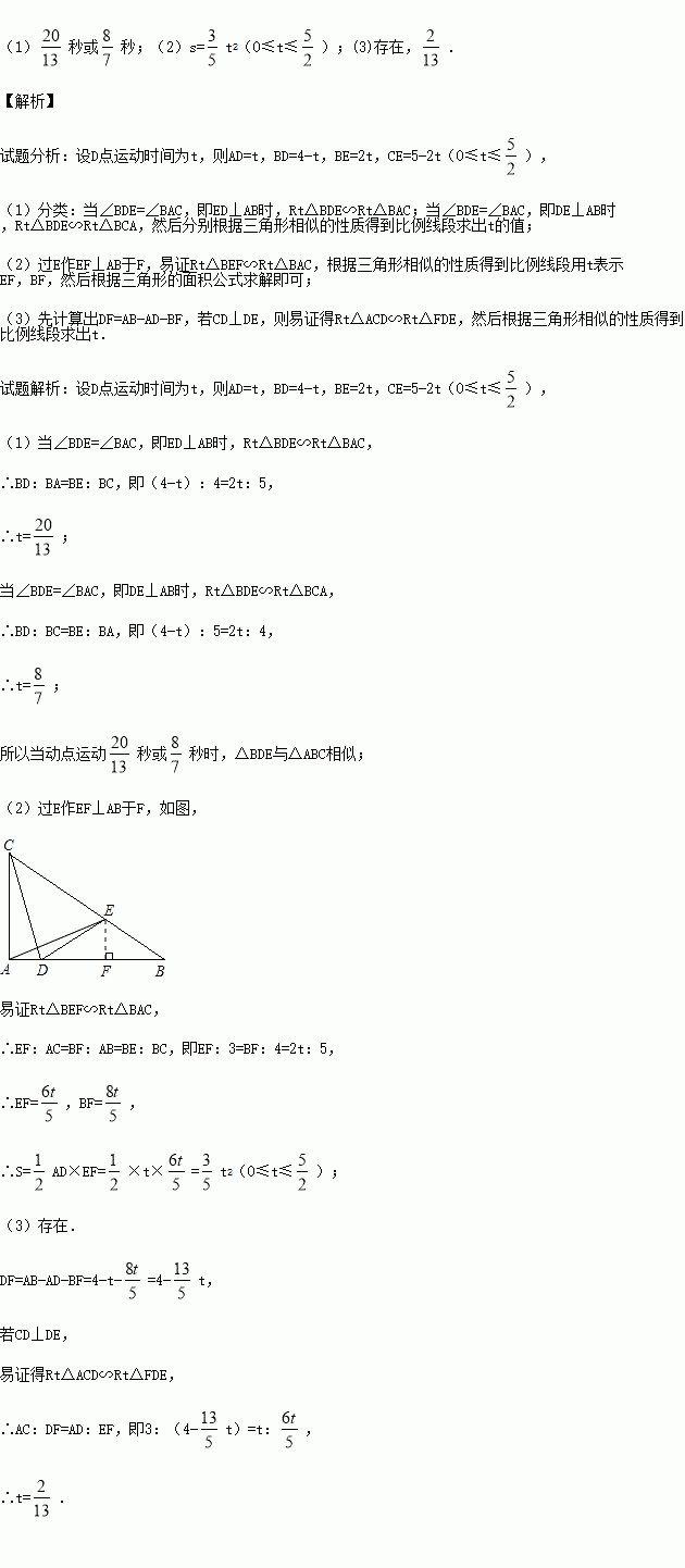 如图,Rt△ABC的两条直角边AB=4cm,AC=3cm,点D沿AB从A向B运动,速度是1cm/秒,同时,点E沿BC从B向C运动,速度为2cm/秒. 动点E到达点C时运动终止.连结DE、CD、AE.(1)填空:当动点运动_______ 秒时,△BDE与△ABC相似?