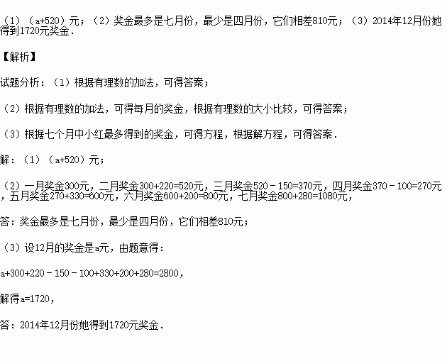 (2)请判断七个月以来小红得到奖金最多是哪个月?最少是哪个月?它们相差多少元?