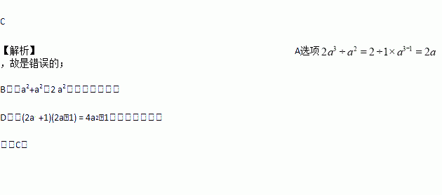 A. 2a3÷a2=a B. a2+a2 = a4 C. (2a+b)2 = 4a2+b2+4ab D. (2a