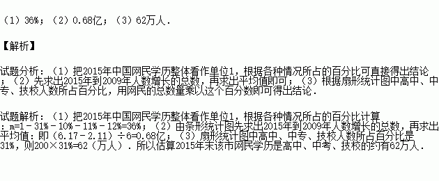 (3)据2015年吉安市人口统计数据显示常住人口为481万人,其中网民数约为200万人.若2015年吉安市的网民学历结构与2015年的中国网民学历结构基本相同,请你估算2015年末该市网民学历是高中、中考、技校的约有多少万人.