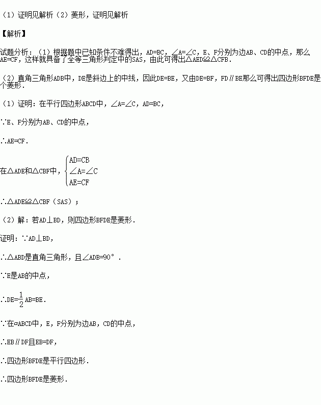 (2)若AD⊥BD,则四边形BFDE是什么特殊四边形?请证明你的结论.