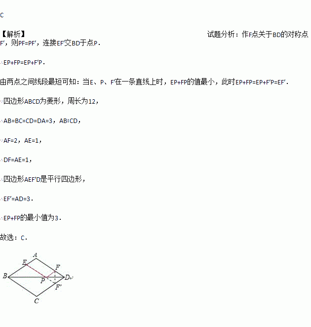 如图,在周长为12的菱形ABCD中,AE=1,AF=2,若P为对角线BD上一动点,则EP+FP的最小值为( )