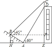 (2)在Rt△ABH中,AH=AB.cos∠BAH=10.cos30°=5$\sqrt{3}$,在Rt△ADE中,tan∠DAE=$\frac{DE}{AE}$,即tan60°=$\frac{DE}{15}$,得到DE=15$\sqrt{3}$,如图,过点B作BF⊥CE,垂足为F,求出BF=AH+AE=5$\sqrt{3}$+15,于是得到DF=DE-EF=DE-BH=15$\sqrt{3}$-5,在Rt△BCF中,∠C=90°-∠CBF=90°-45°=45°,求得∠C=∠CBF=45°,得出CF=BF=5$\sqrt{3}$+15,即可求得结果.