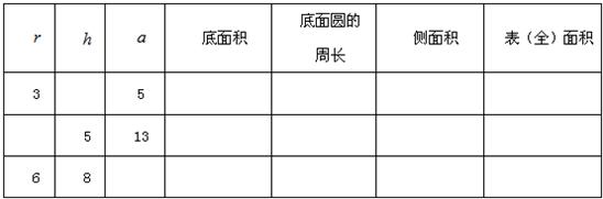 | r | h | a | 底面积 | 底面圆的 周长 | 侧面积 | 表(全)面积 |