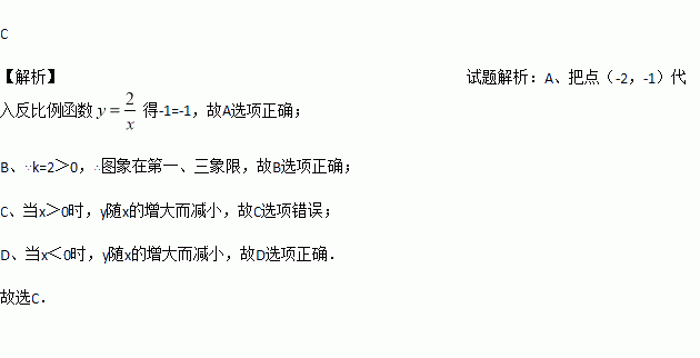A. 点(-2,-1)在它的图像上 B. 它的图像在第一、三象限