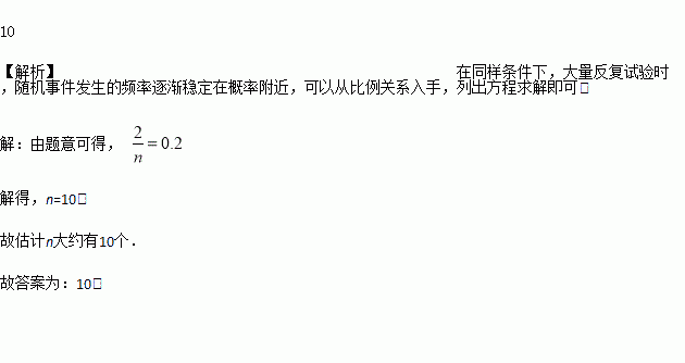 在一个不透明的盒子中装有n个小球,它们只有颜色上的区别,其中有2个红球.每次摸球前先将盒中的球摇匀,随机摸出一个球记下颜色后再放回盒中,通过大量重复摸球实验后发现,摸到红球的频率稳定于0.2,那么可以推算出n大约是________.