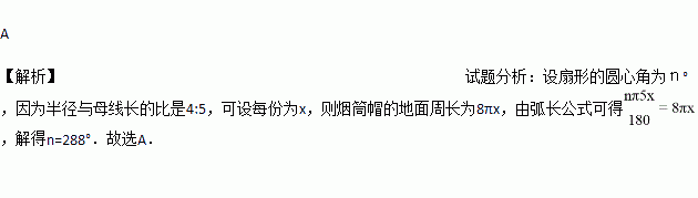 要制作一个圆锥形的烟囱帽,使底面圆的半径与母线长的比是4:5,那么所需扇形铁皮的圆心角应为( )