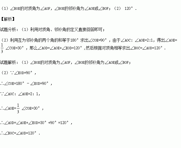(2)若∠AOC:∠AOE=2:1,∠EOD=90°,则∠BOC为多少度?