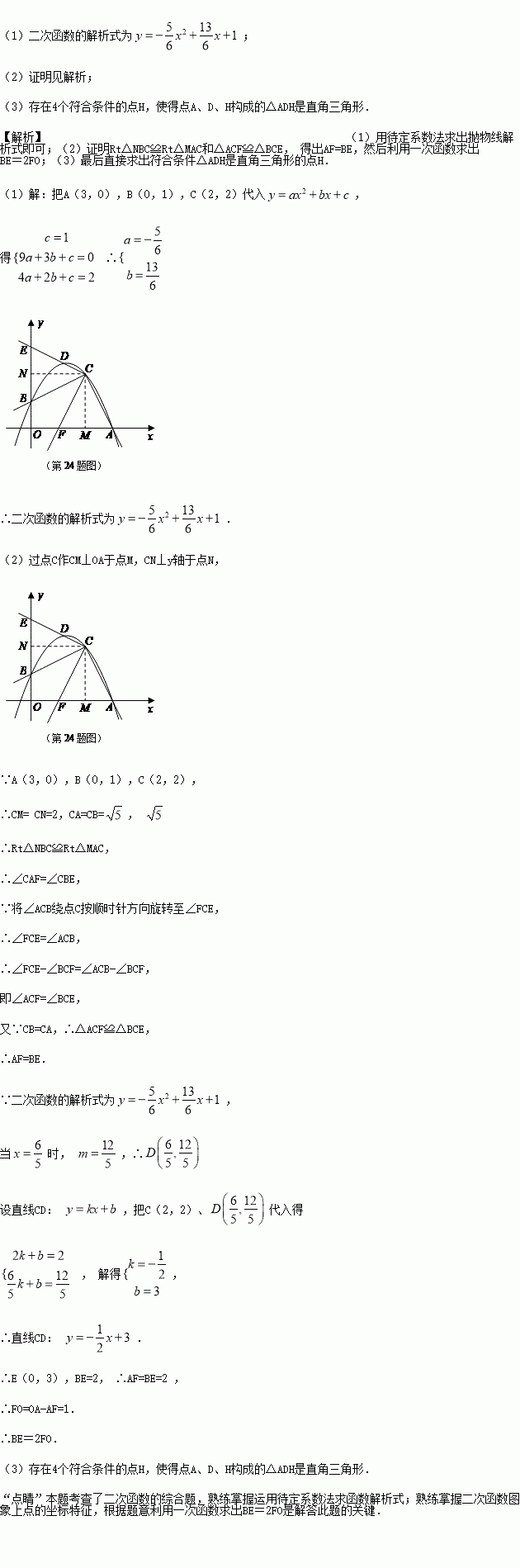 (3)是否存在点H(n,2),使得点A、D、H构成的△ADH是直角三角形?若存在,有几个符合条件的点H?(直接回答,不必说明理由)