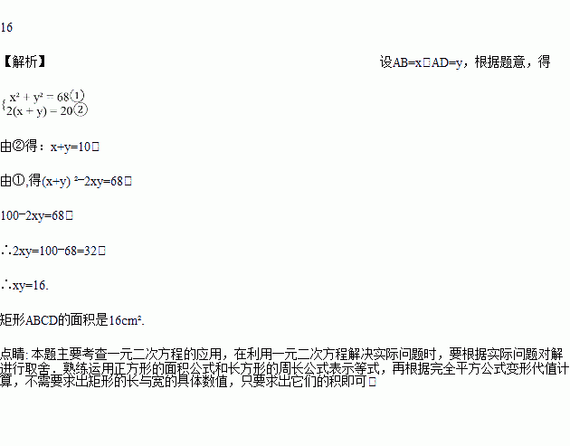 如图,长方形ABCD的周长是20cm,以AB、AD为边向外作正方形ABEF和正方形ADGH,若正方形ABEF和ADGH的面积之和为68cm2,那么矩形ABCD的面积是______cm2.