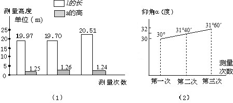 他们测得了三组数据后,制成了测点到大树的距离l,测倾器的高a的数据的条形统计图(如图1)和仰角 α数据的折线统计图(如图2).