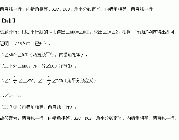 在下面的括号内,填上推理的根据:如图,已知AB∥CD,BE平分∠ABC,CF平分∠BCD,求证:BE∥CF.