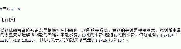 为了增强公民的节水意识,某市制定了如下用水收费标准:每户每月的用水不超过10吨时,水价为每吨1.2元,超过10吨时,超过的部分按每吨1.8元收费,该市某户居民5月份用水x吨(x>10),应交水费y元,则y关于x的函数关系式是 .