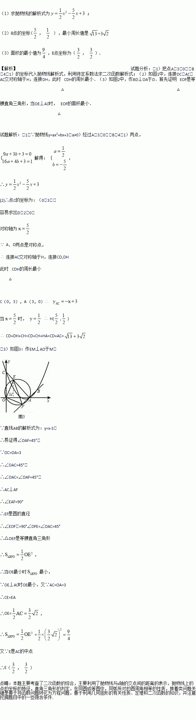 (3)如图2,连接AC,E为线段AC上任意一点(不与A、C重合),经过A、E、O三点的圆交直线AB于点F,当△OEF的面积取得最小值时,求面积的最小值及E点坐标。