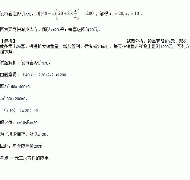 在北京2008年第29届奥运会前夕,某超市在销售中发现:奥运会吉祥物— “福娃”平均每天可售出20套,每件盈利40元。为了迎接奥运会,商场决定采取适当的降价措施,扩大销售量,增加盈利,尽快减少库存。经市场调查发现:如果每套降价4元,那么平均每天就可多售出8套。要想平均每天在销售吉祥物上盈利1200元,那么每套应降价多少?