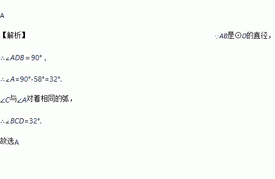 如图,若AB是⊙O的直径,CD是⊙O的弦,∠ABD=58°,则∠BCD的度数为( )