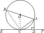 分析 (1)连接OC,由OA=OC,利用等边对等角得到∠OAC=∠OCA,由∠DAC=∠BAC,等量代换得到一对内错角相等,得到AD与OC平行,由AD垂直于EF,得到OC垂直于EF,即可得到EF为圆O的切线;