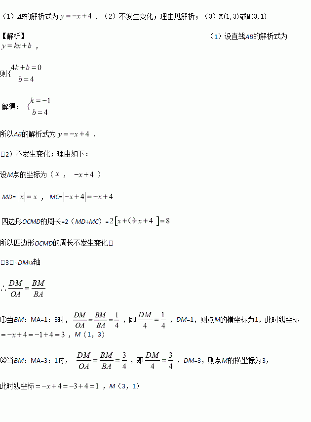 (2)过点M分别作MC⊥OA于点C,MD⊥OB于点D,当点M在AB上运动时,你认为四边形OCMD的周长是否发生变化?并说明理由;