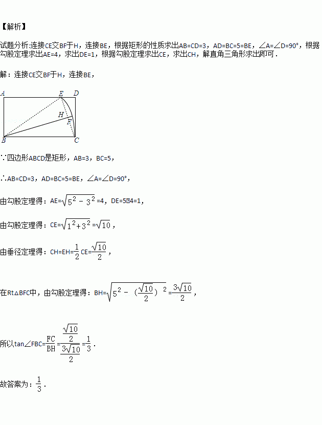 如图,在矩形ABCD中,AB=3,BC=5,以B为圆心BC为半径画弧交AD于点E,如果点F是弧EC的中点,联结FB,那么tan∠FBC的值为 .