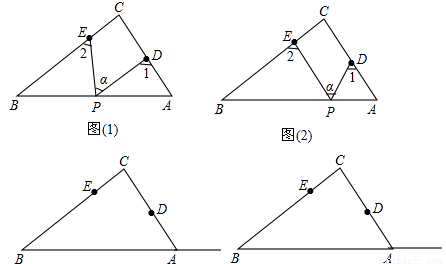 Rt△ABC中,∠C=90°,点D、E分别是△ABC边AC、BC上的点,点P是一动点.令∠PDA=∠1,∠PEB=∠2,∠DPE=∠α.