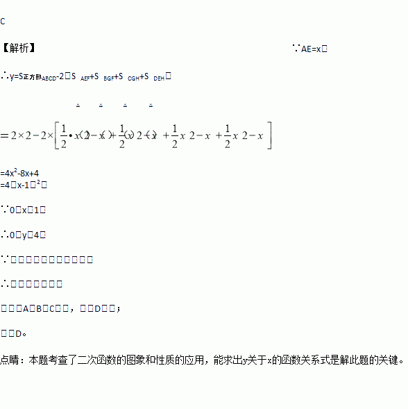 如图正方形ABCD的边长为2,点E、F、G、H分别在AD、AB、BC、CD上的点,且AE=BF=CG=DH,分别将△AEF、△BFG、△CGH、△DHE沿EF、FG、GH、HE翻折,得四边形MNKP,设AE=x,S四边形MNKP=y,则y关于x的函数图像大致为 ( )