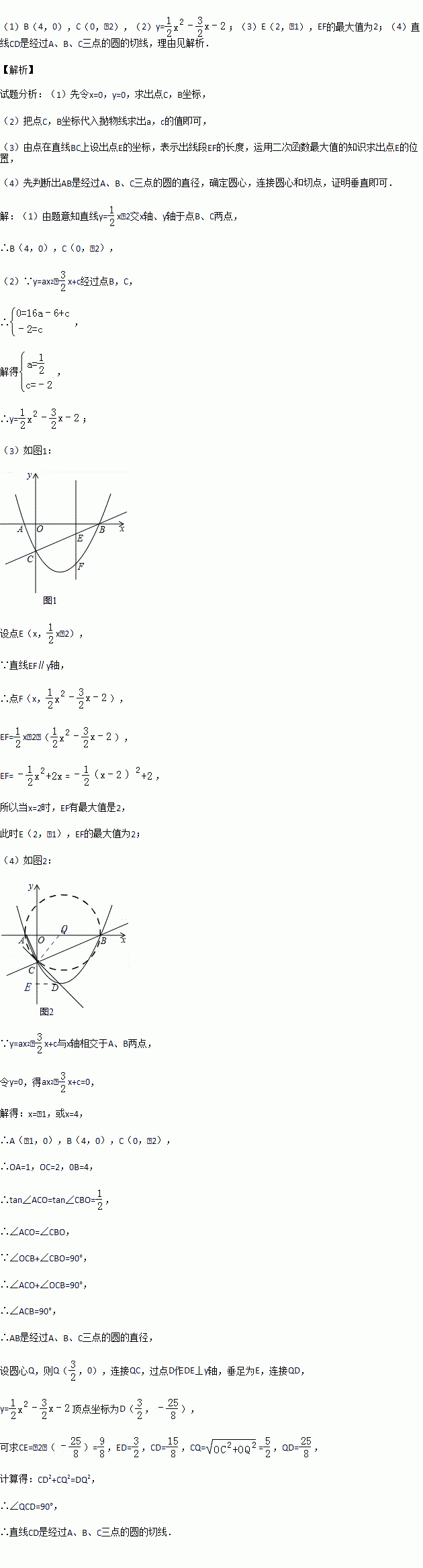 (4)如图2,点D是抛物线的顶点,判断直线CD是否是经过A、B、C三点的圆的切线,并说明理由.