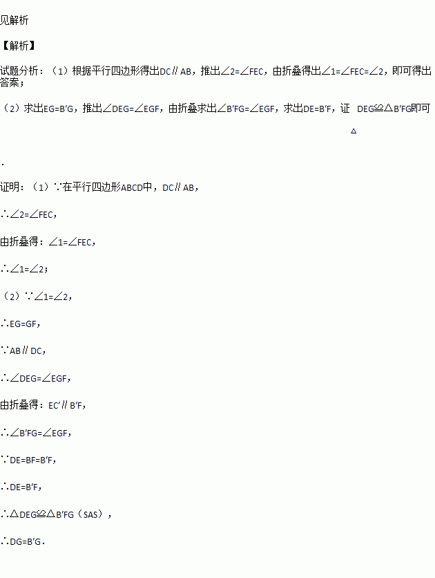 如图,在?ABCD中,点E,F分别在边DC,AB上,DE=BF,把平行四边形沿直线EF折叠,使得点B,C分别落在B′,C′处,线段EC′与线段AF交于点G,连接DG,B′G.